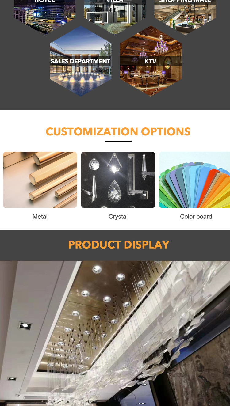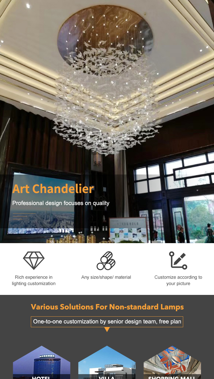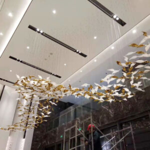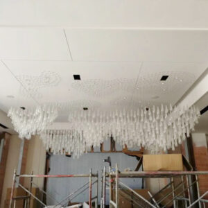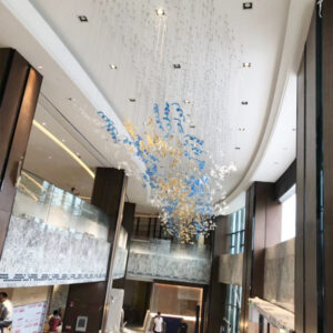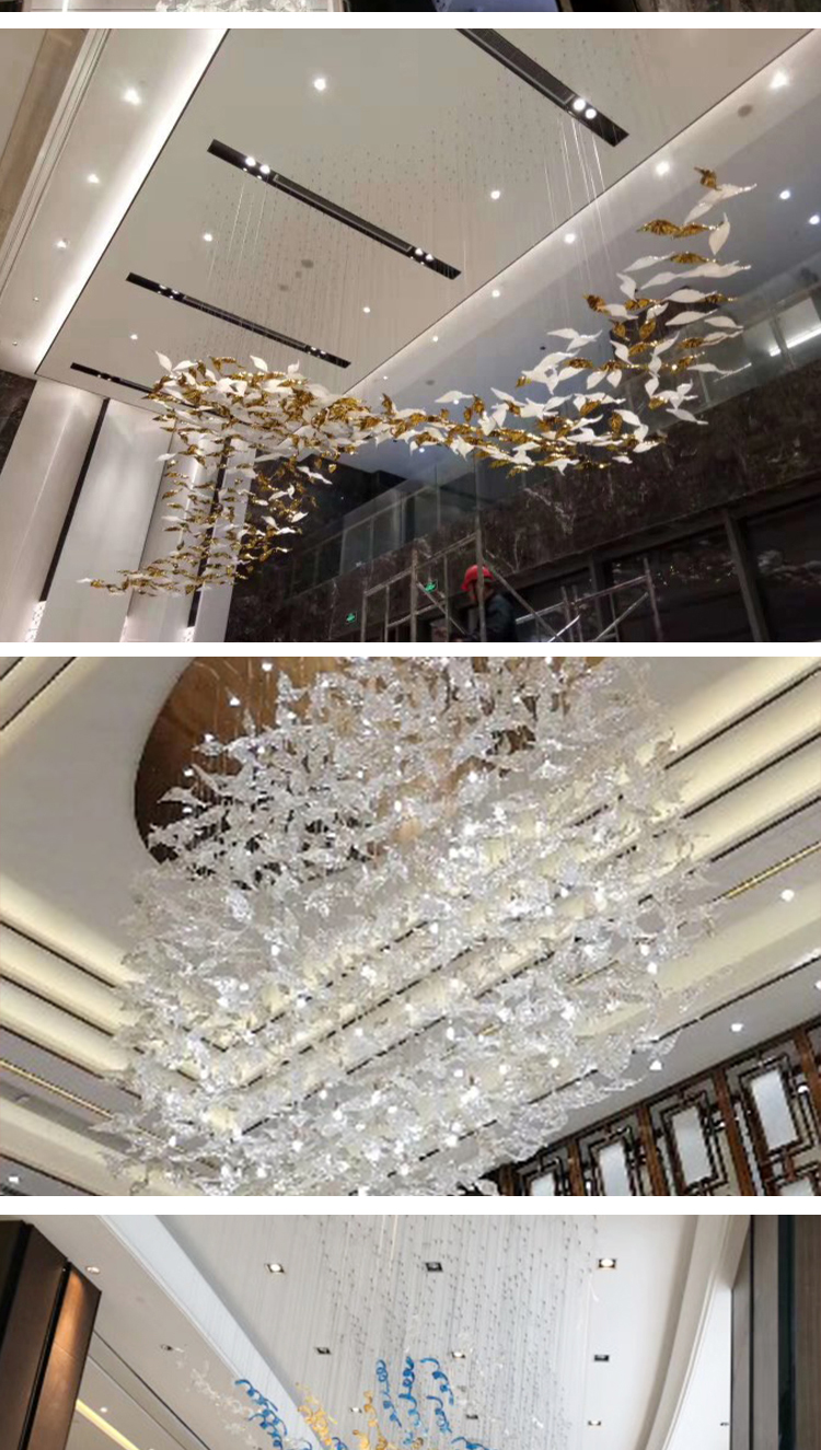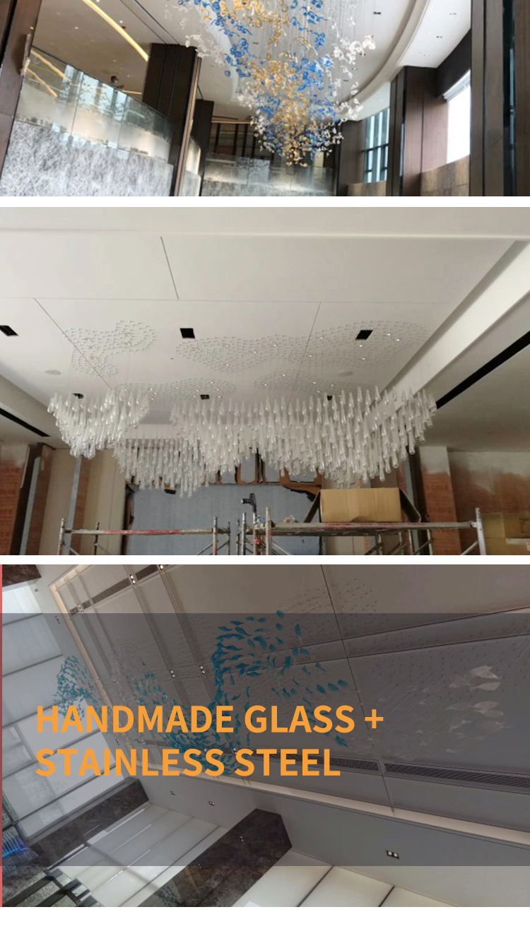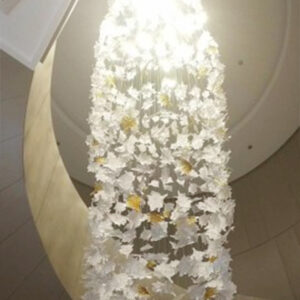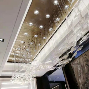 “Exquisite LX22070712 Handcrafted Glass and Stainless Steel Art Chandelier, designed to capture the beauty of delicate, suspended glass elements. This luxurious chandelier features intricate glass shapes and a sleek stainless steel frame, creating a stunning visual centerpiece for high-end interiors like lobbies and elegant living spaces.”